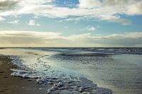 Het strand van de Noordzee. Het schuim van de golven ligt rustig op het strand. De wolken steken mooi af tegen het strand en de zee.