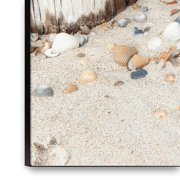 Koop de foto Strand met strandpalen en schelpen. van Ron van der Stappen op canvas, aluminium dibond, (ingelijste) fotoprint, behang en ArtFrame, op maat geprint in Fine-Art kwaliteit.