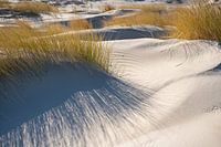 Kleine zandduinen op het lege strand van het eiland Schiermonnikoog in het Waddenzeegebied. helmgras groeit op de kleine zandduinen op het lege strand tijdens deze mooie winterdag met de golven van de Noordzee op de achtergrond. Schiermonnikoog maakt deel uit van de Friese Waddeneilanden en staat bekend om zijn prachtige natuur, waaronder zandstranden, glooiende duinen en weelderige wetlands.
