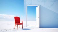 Een rode stoel staat op een breed, wit strand naast een open deur die leidt naar de heldere, blauwe lucht. De scène combineert surrealistische elementen met het sterke contrast tussen sterk rood en rustig blauw en wit....Digital art image, ontwerp en compositie door mij, visualisatie met AI