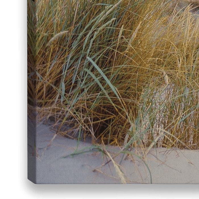 De zon zakt hier langzaam onder op het strand van Ameland in de zomer. De laatste zonnestralen schijnen nog net door het halmgras op het duin.