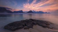 Foto genomen bij zonsondergang aan het strand van Haukland in de Lofoten.