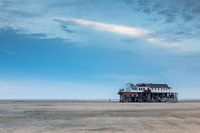 Een vrouw staat bij de paalwoningen op het Noordzeestrand bij Sankt Peter-Ording.