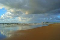 Foto van het strand van Den Haag / Scheveningen met reflectie van de wolken en de Pier van Scheveningen.