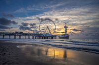Strand van Scheveningen, Den Haag, met op de achtergond de pier en reuzenrad en een reflectie in het water. Nederland, Europa