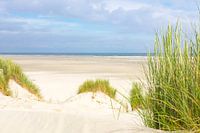 Zicht op het Noordzee strand op het Waddeneiland Terschelling vanuit de duinen. Het strand is verlaten op deze vroege ochtend in de zomer terwijl de zon langzaam door de wolken breekt.