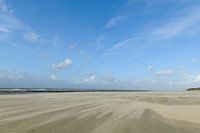 Strand van het Waddeneiland Vlieland tijdens een winderige dag in de zomer. Het strand is leeg en verlaten en zand stuift over de grond.