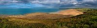 Het strand van le Rozel in Manche, Normandië, Frankrijk. Uitzicht over het strand van le Rozel met de heuvels en de zee. Panoramafoto van de natuur in Frankrijk.