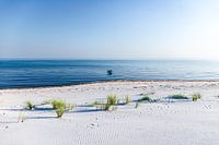 Wit zandstrand aan de Oostzeekust op het schiereiland Fischland Darss Zingst, onder een stralend blauwe hemel.