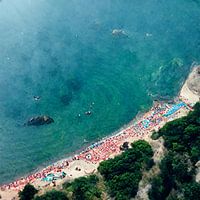 Azuurblauwe zee, witte stranden, rotsen en poeltjes water tussen de rotsen door, mensen op het strand en in de zee: zomer in het zuiden van Europa.