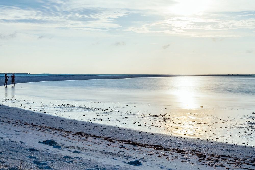 Blauw uur op het witte strand van de Malediven met wolken aan de hemel en weerspiegeling van de zon en de wolken in het water