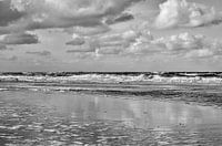 Strand tijdens minder goed weer. Mooie wolkenpartijen en een roerige zee. Prachtig schuim in de voorgrond. Deze keer in Zwart/Wit.