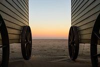 Strandhuisje op het strand van Bredene , deze cabines staan nog op wielen , vandaag enkel uit melancholie In conservatievere tijden werden de cabines in zee getrokken door paarden ,zo konden de preutse badgasten ongestoord en uit het zicht een frisse duik nemen .