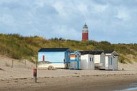 Door kunstenares Angelina Stiehl beschilderde strandcabine met op de achergrond Vuurtoren Eierland.