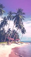 Dit beeld toont een tropische strandscène die baadt in het roze en paarse licht van een ondergaande of opkomende zon, wat een dromerige en bijna surrealistische sfeer creëert.