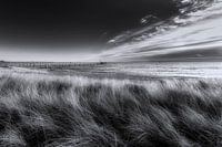 Op de achtergrond ziet u de oude pier van Haffkrug met de Oostzee in het prachtige zonlicht. Zwart-wit foto. 320100ays