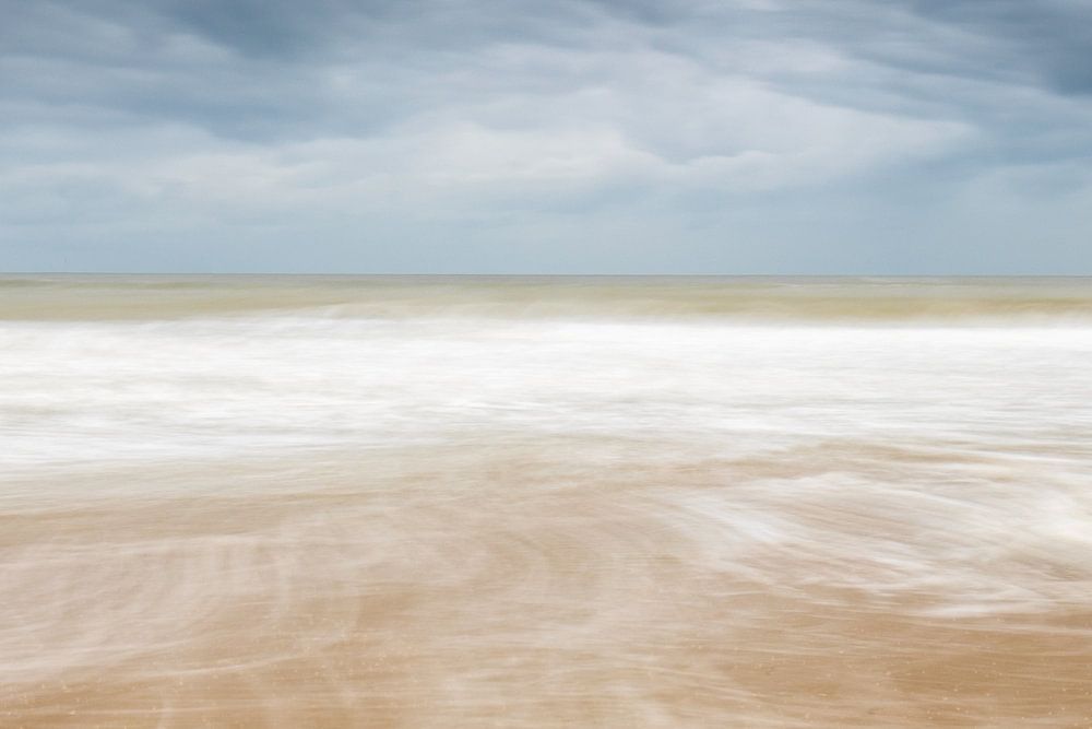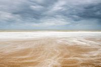Simpele strandbeeld bestaande uit koude en warme tonen. Dreigende lucht boven de strand. Door de lange sluitertijd geeft het terugtrekkende tij mooie tekeningen op het strand.