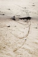 Delicaat helmgras op het strand van de Baltische Zee werpt een brede schaduw in het tegenlicht, smalle focuszone, het beeld is rijk aan contrast en desaturated