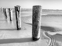 Het strandhout op het Deense Noordzee-eiland Rømø. Zwart-wit fotografie.