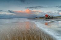 Strandhuis op palen op het strand bij Petten Nederland. De zonsondergang en lange sluitertijd zorgen voor een mooi beeld.