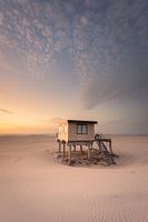 Een eenzaam strandhuisje staat op hoge palen in het uitgestrekte zand van het strand bij Nes op Ameland. De ondergaande zon kleurt de lucht zacht oranje en roze, terwijl fijne wolkenpartijen de hemel sierlijk vullen. De eenvoud van het gebouw contrasteert prachtig met de weidsheid van het landschap. Dit beeld ademt rust, vrijheid en de…