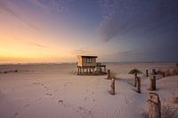 Aan het stille strand nabij Nes op Ameland staat dit eenzame strandhuisje, hoog op palen boven het zand. De zon zakt langzaam richting de horizon en dompelt het eiland onder in warm, zacht licht. De lucht kleurt van goud naar violet, terwijl het zand in de voorgrond nog de sporen draagt van een eenzame wandeling.