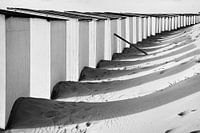 Een rij strandhuisjes op Texel met een mooie schaduwwerking in zwart/wit