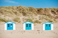 Blauw/witte strandhuisjes op Texel tegen de duinen aan.