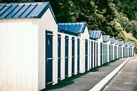 Strandhuisjes op het strand in Etables Sur Mer, Bretagne, Frankrijk tijdens een mooie zomerdag.