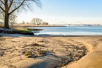 Zandstrandje in het Nederlandse natuurgebied De Groesplaat op de uiterwaarden van de rivier Boven-Merwede bij het Nederlandse dorp Sleeuwijk, gemeente Altena, Noord-Brabant. Het is een zonnige dag in het winterseizoen. Op de achtergrond is de Merwedebrug vaag zichtbaar.