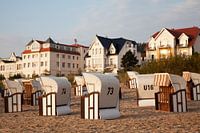 Strandkorbe bij Bansin, Duitsland. Op stranden bij de kunstplaatsen in het Noorden van Duitsland staan vaak strandstoelen of Strandkorbe. Vroeger waren deze strandstoelen van riet, tegenwoordig meestal van kunststof.