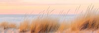 Zachte golven kussen de horizon, terwijl gouden grassen zachtjes wiegen in het warme licht van de schemering. De hemel schittert in delicate pastelkleuren en straalt een harmonieuze rust uit. Deze idyllische omgeving straalt een bijna droomachtige sfeer uit waarin de tijd lijkt stil te staan en de natuur je uitnodigt tot een rustige dialoog.