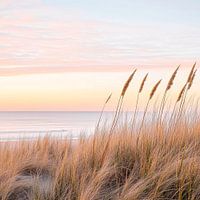 Zachte golven omhelzen het strand terwijl de laatste zonnestralen de hemel baden in zachte pastelkleuren. Hoge grassen wiegen zachtjes in de avondbries en omlijsten het vredige landschap. Deze harmonieuze ontmoeting tussen aarde en zee nodigt je uit om te genieten van het moment van vrede en schoonheid.