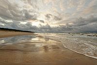Wijds uitzicht over een verlaten strandgedeelte, op de voorgrond ondiepe watervlakten met zicht op de horizon, daarboven deels dramatische wolken die een weersverandering aankondigen - lokatie: Poolse Oostzeekust, Slowinski Park Narodowy (Sloveens nationaal park)