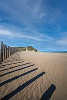 De duinen op de achtergrond, begroeid met helmgras, herinneren aan de voortdurende strijd en samenwerking tussen mens en natuur: het zand dat zich wil verplaatsen en de palen die de stroming ervan geleiden. Het heldere blauw van de lucht en de warme zandtinten roepen een sfeer van rust, openheid en vrijheid op – een typisch Nederlands kustgevoel.