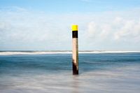Abstract lijnenspel in een Mondriaan-achtige setting, gevormd door een houten strandpaal met geel-zwarte kop tegen een uitgesmeerde watervlakte en een zacht blauwe lucht. Gevonden aan de noordkant van het Waddeneiland Texel.