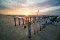 Een fraai gekleurde lucht boven een rij strandpaaltjes tijdens zonsondergang, in de buurt van strandpaviljoen Berkenbosch bij Oostkapelle, Zeeland.
