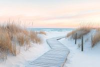 Zachte pastelkleuren strekken zich uit over de horizon en smelten samen met het fijne zandstrand. Een gebogen houten wandelpad leidt door delicate duinen, omarmd door hoge grassen waarvan de toppen dansen in de wind. De rust van het moment nodigt je uit om te ontspannen en de oceaan in al zijn oneindigheid te bewonderen.