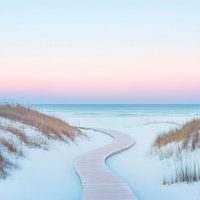 Een zacht houten pad baant zich een weg door het fijne, witte zand, omlijst door fijne grassen die dansen in de wind. Op de achtergrond smelten de lucht en de zee samen in een dromerig spel van pastelkleuren, terwijl het schemerlicht het landschap omhult in een magische sfeer. Uitnodigend en rustig ontvouwt zich hier de schoonheid van het kustlandschap.
