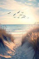 Een zacht pad van goudkleurig zand baant zich een weg door hoog, glinsterend gras, terwijl de zachte golven van de zee zachtjes kabbelen op de achtergrond. Vogels dansen boven de horizonlijn in het warme licht van de ondergaande zon, die de wolken kleurt in zachte pasteltinten. De tijd lijkt hier stil te staan, vol vrede en ongerepte schoonheid.