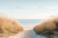 Een zacht pad baant zich een weg door hoog, goudkleurig gras en komt uit op een kalme, blauwe zee. De lucht straalt in zachte pastelkleuren terwijl vogels elegant over het wateroppervlak glijden. Dit vredige landschap nodigt je uit om te dromen en te vertoeven, alsof de natuur speciaal voor dit magische moment is geschapen.
