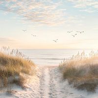 Een zacht pad baant zich een weg tussen hoge grassen en leidt naar het glinsterende water, waar de horizon betovert met een delicaat lichtspel. Vogels dansen in de lucht terwijl de golven zachtjes kabbelen op de oever. Dit landschap ademt rust en laat de ziel opbloeien.