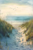 Een zacht pad van fijn zand baant zich een weg tussen hoge, met gras begroeide duinen, terwijl de horizon de golven in zachte blauwtinten omarmt. Vogels vliegen met hun elegante lijnen in de lucht, terwijl een zacht briesje door de lucht waait en een gevoel van vrijheid en rust uitstraalt. Een uitnodigend paradijs dat je uitnodigt om te…