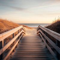 Een pittoreske houten steiger baant zich een weg tussen de zachte duinen, terwijl het gouden licht van de avondzon zachtjes breekt op het wateroppervlak. Het rustige landschap belooft sfeervolle ontspanning op het strand, waar het geluid van de golven en de zoute bries je uitnodigen om te blijven hangen. Een verborgen paradijs dat wacht om ontdekt te worden.