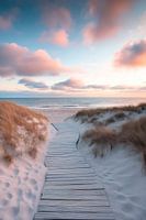 Een betoverd houten pad slingert zich een weg door glooiende duinen. Gouden grassen wiegen in de zachte wind, terwijl zachte wolken de lucht kleuren in pasteltinten. De oceaan glinstert in de verte en nodigt je uit om te dromen, waar de dag aanbreekt met nieuwe mogelijkheden en de rust van de natuur betovert.