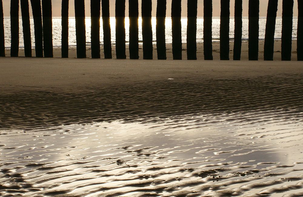 Rij strandpalen op een bewolkte dag met op voorgrond patronen in het strand zand.