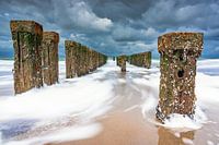 De stranden van Zeeland zijn ondenkbaar zonder de enkele of dubbele palenrijen. Het zijn golfbrekers om afkalving van strand, duinreep of rivieroever tegen te gaan. Deze rij van door de zee, wind en schelpen verweerde palen krijgen dynamiek door de zich terugtrekkende zee.