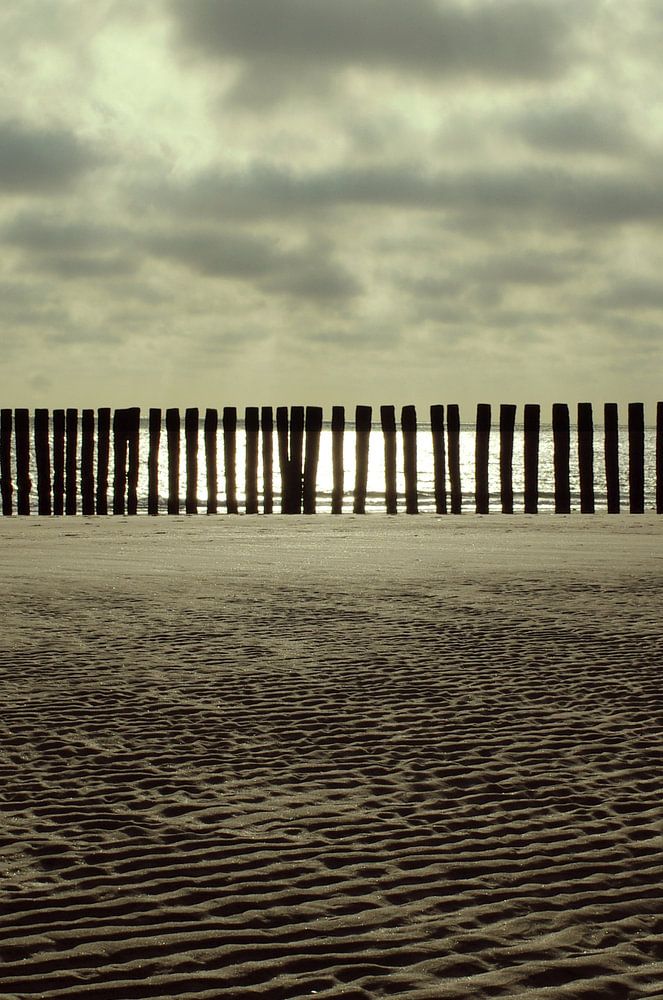 Rij strandpalen op een bewolkte dag met op voorgrond patronen in het strand zand.