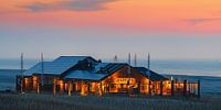 Een 2:1 foto van een zonsondergang bij strandpaviljoen 't Badhuys op Vlieland, gelegen tegen de duinen op het Noordzeestrand aan de noordkant van het Waddeneiland.