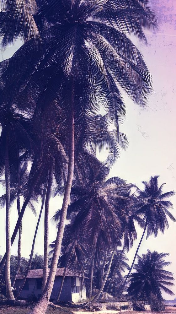 Dit beeld toont een tropisch strand tafereel ondergedompeld in een dromerig paars en violet kleurenschema.